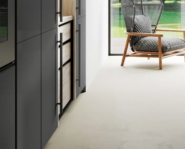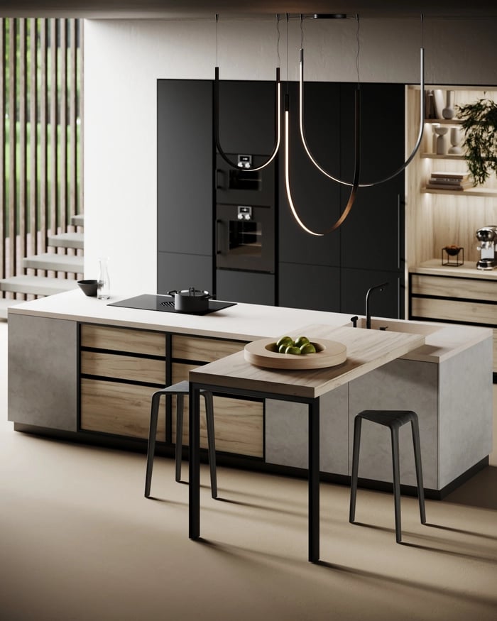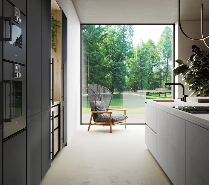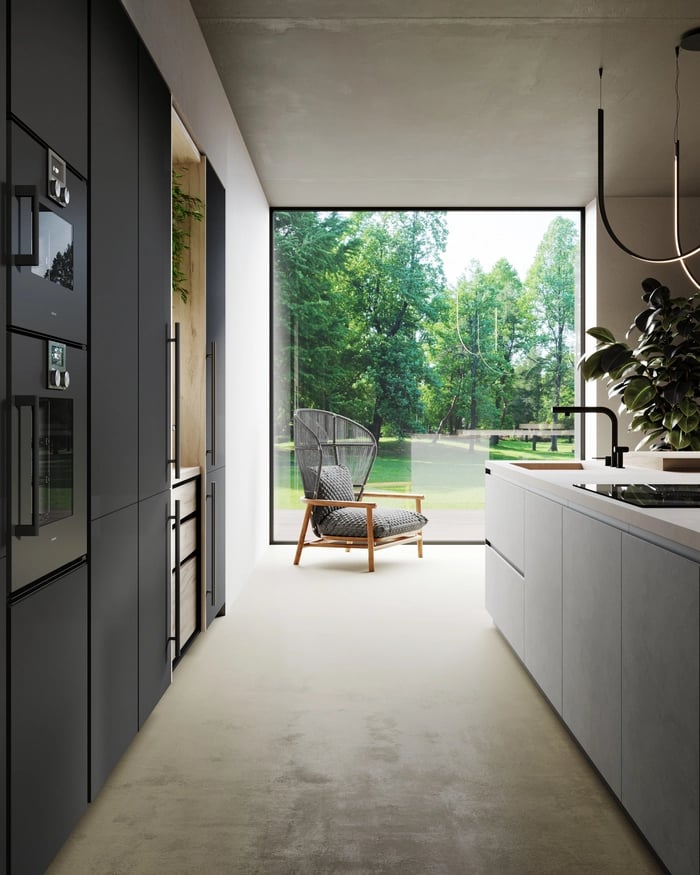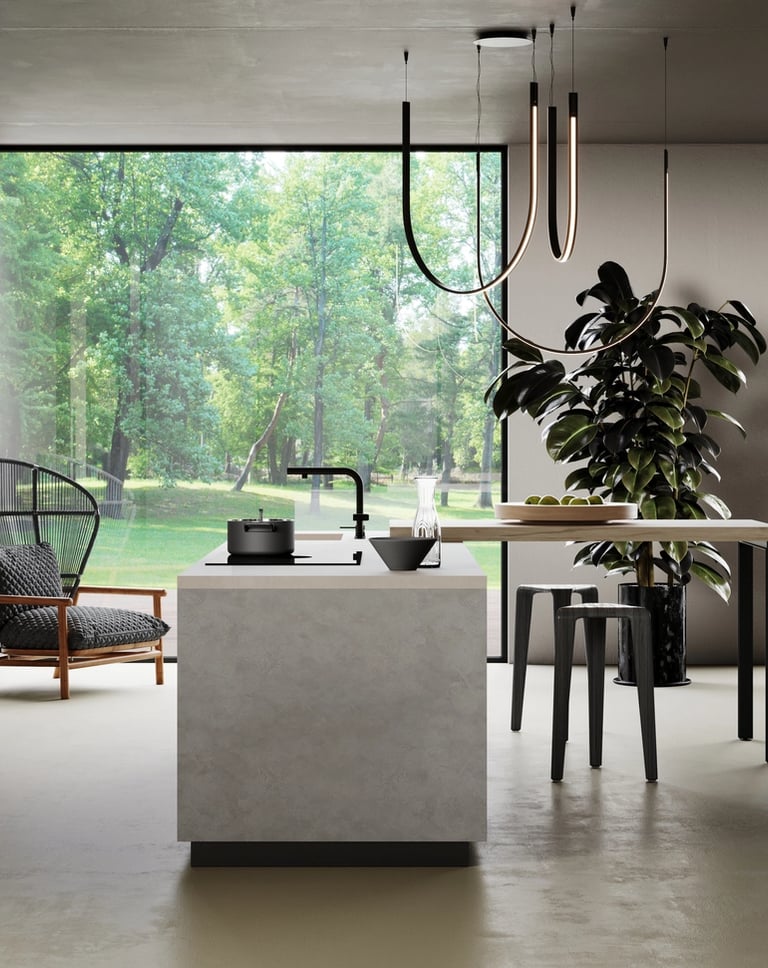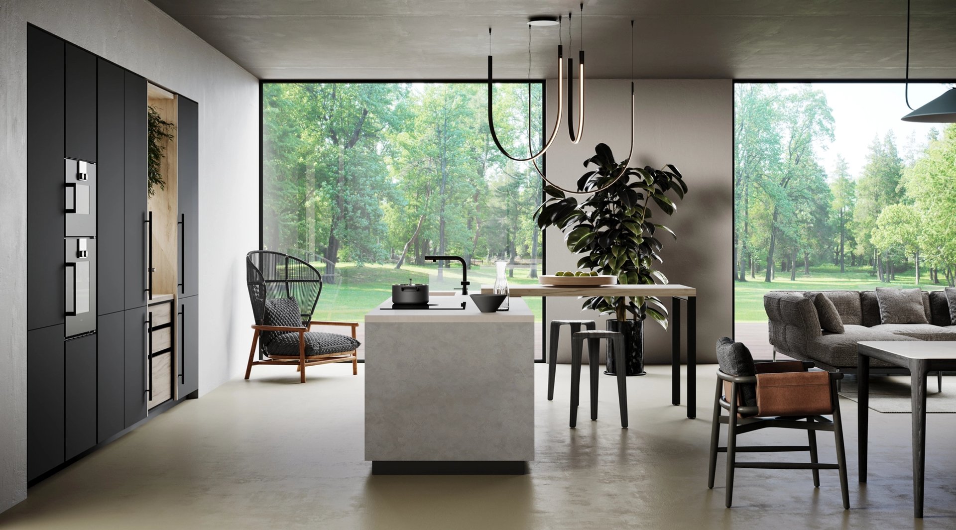 Détail de la poignée IRON en aluminium noir trafic. À gauche, l'îlot est en Bilaminato Cemento Beton Giove avec une poignée Jay en noir mat.
