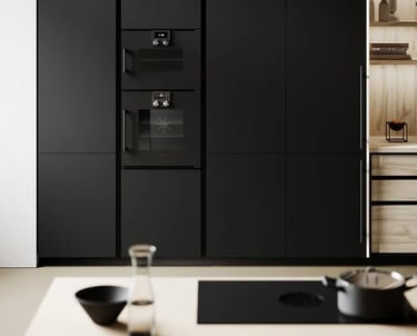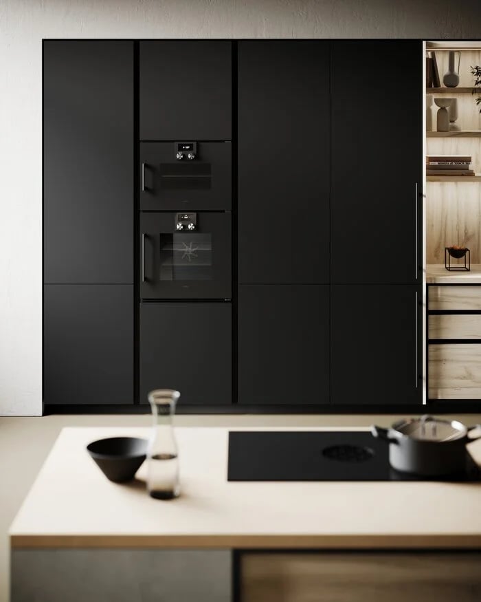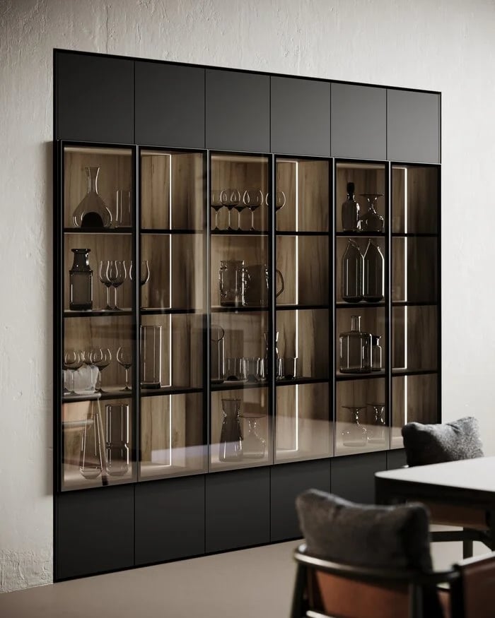 À droite, les colonnes sont en Ménta Laminato PET Nero Onice, et la niche ouverte est en Bilaminato Legno Rovere Scandy.