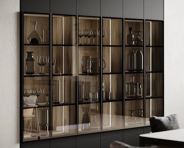 Buffet avec module vitrine Petra, structure et étagères en Bilaminato Legno Rovere Scandy et verre fumé. Les portes supérieures et inférieures sont en Laminato PET Nero Onice opaco.