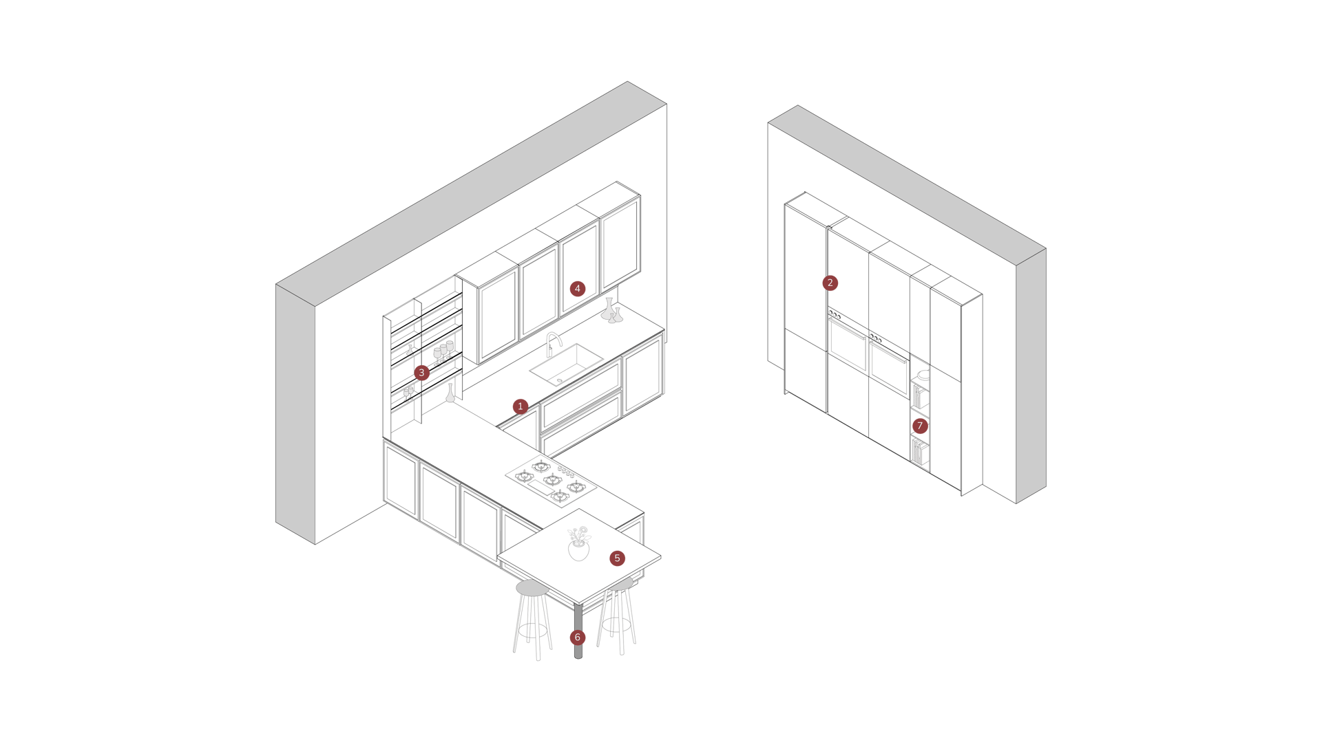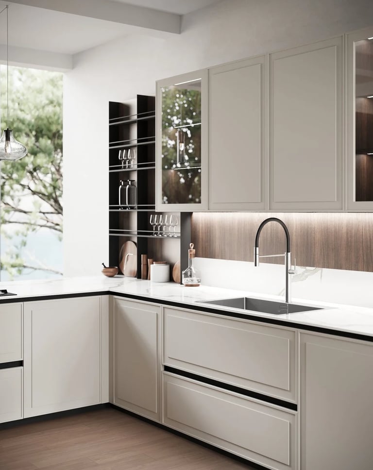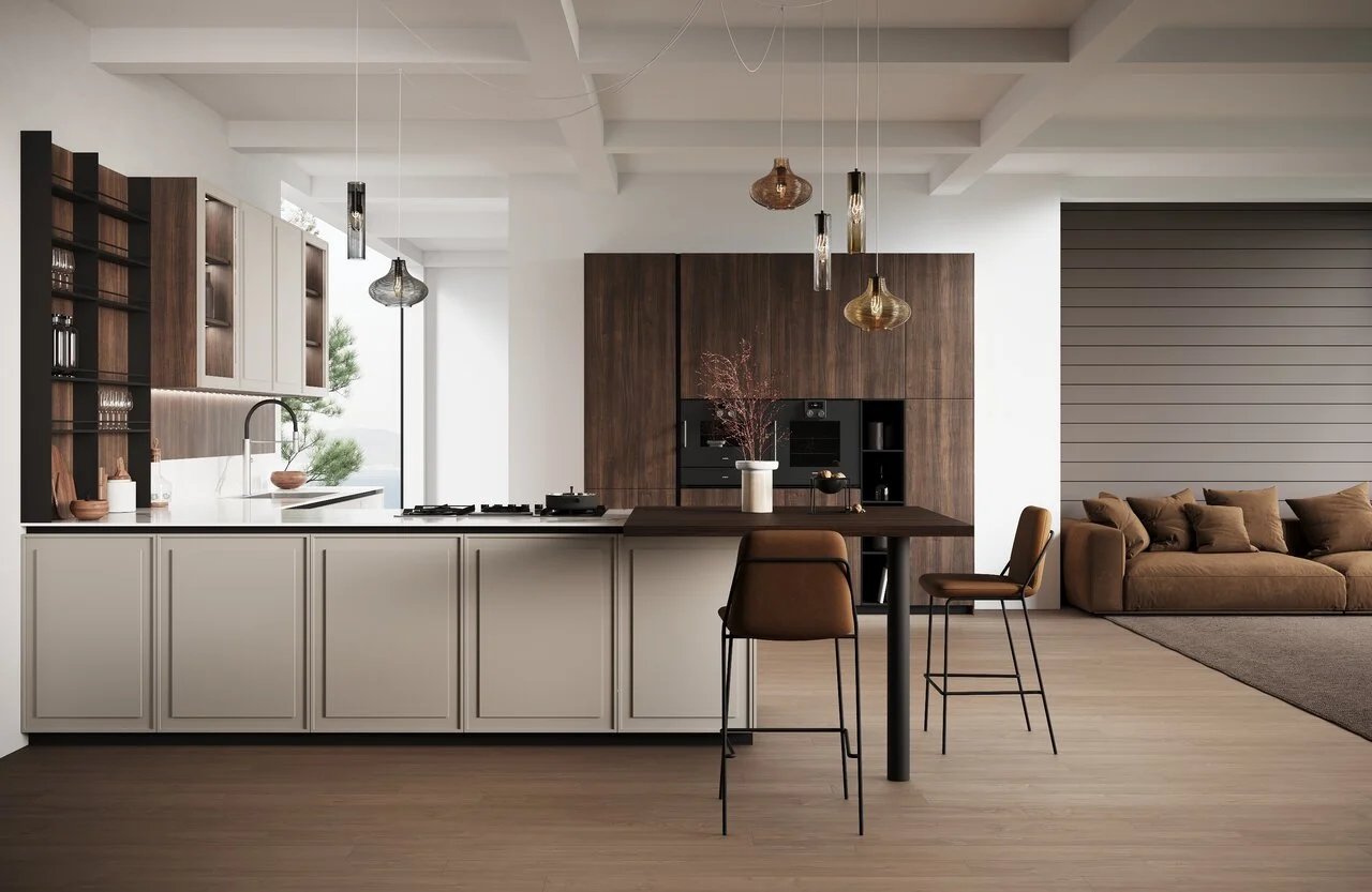 La péninsule avec porte Tes est en Laccato Opaco Grigio Box avec un système d'ouverture à gorge rayon 0 en noir trafic, et le plan de travail est en Gres Statuario Opaco d'une épaisseur de 1,2 cm.