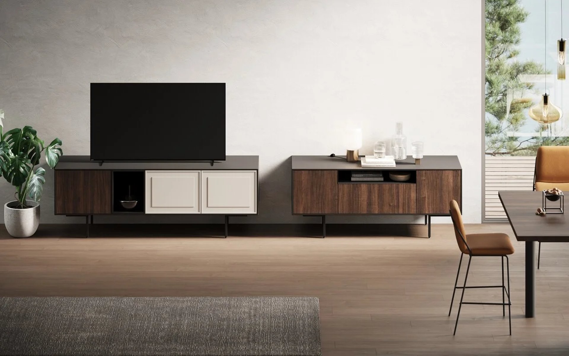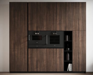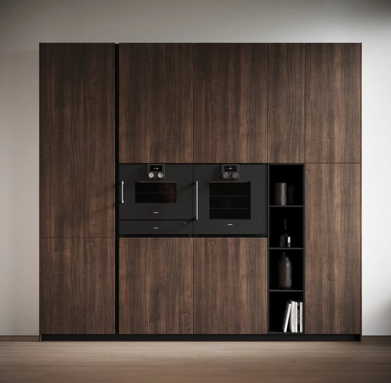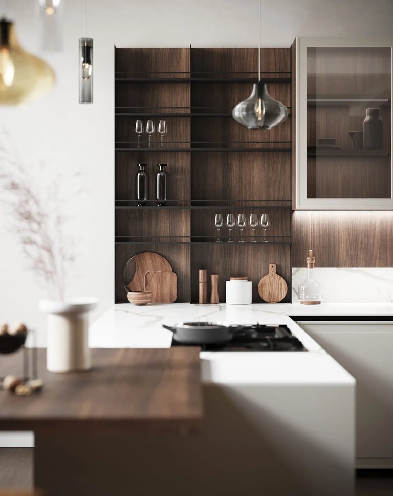 Les colonnes sont Ménta en Bilaminato Legno Noce Monza, et la niche ouverte est en Laminato PET Nero Onice de 12 mm.