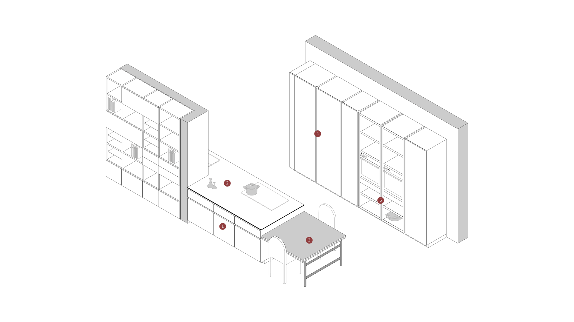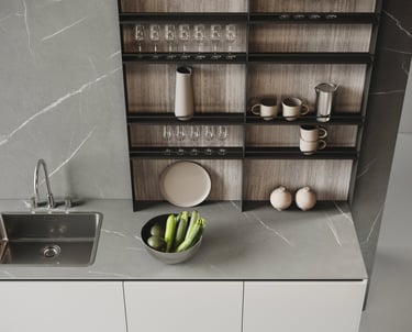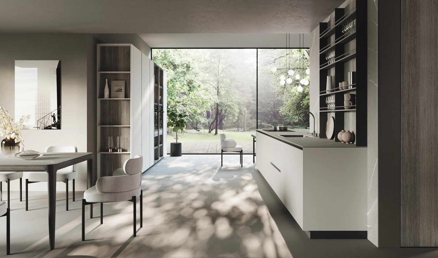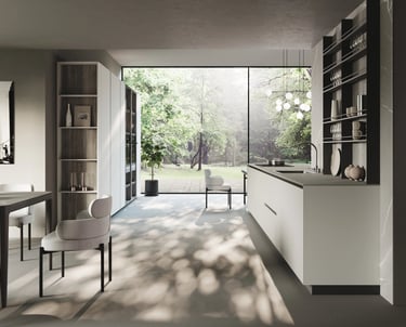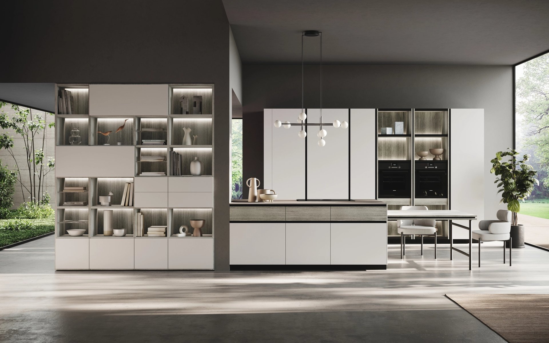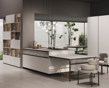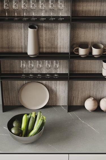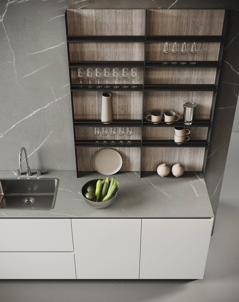 L'îlot est en Bilaminato Opaco Grigio Emme avec une ouverture à gorge rayon 0 en noir trafic, et le plan de travail est en Gres Pietra Piasentina Grigio Fiammato. La bibliothèque et le plan Sandwich sont en Bilaminato Legno Eucalipto Fumo.