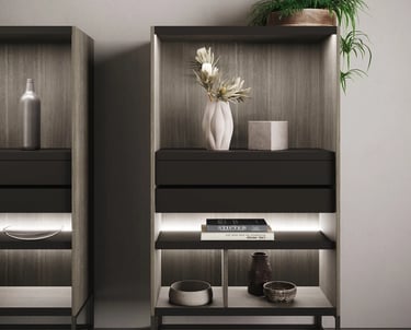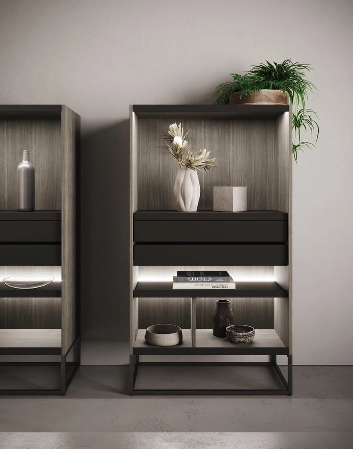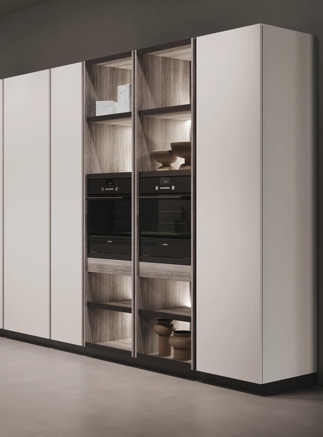 Les buffets sont en Bilaminato Legno Eucalipto Fumo. Les colonnes reprennent les mêmes matériaux également dans le système Waind, en association avec le Bilaminato Opaco Grigio Emme des modules adjacents.