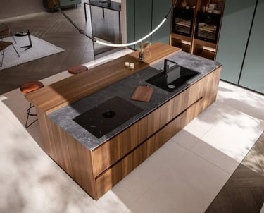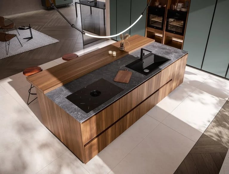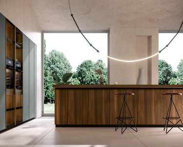 L'îlot est en Bilaminato Legno Noce Cordesco, et le plan de travail est en Gres Nero Greco d'une épaisseur de 1,2 cm.