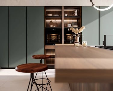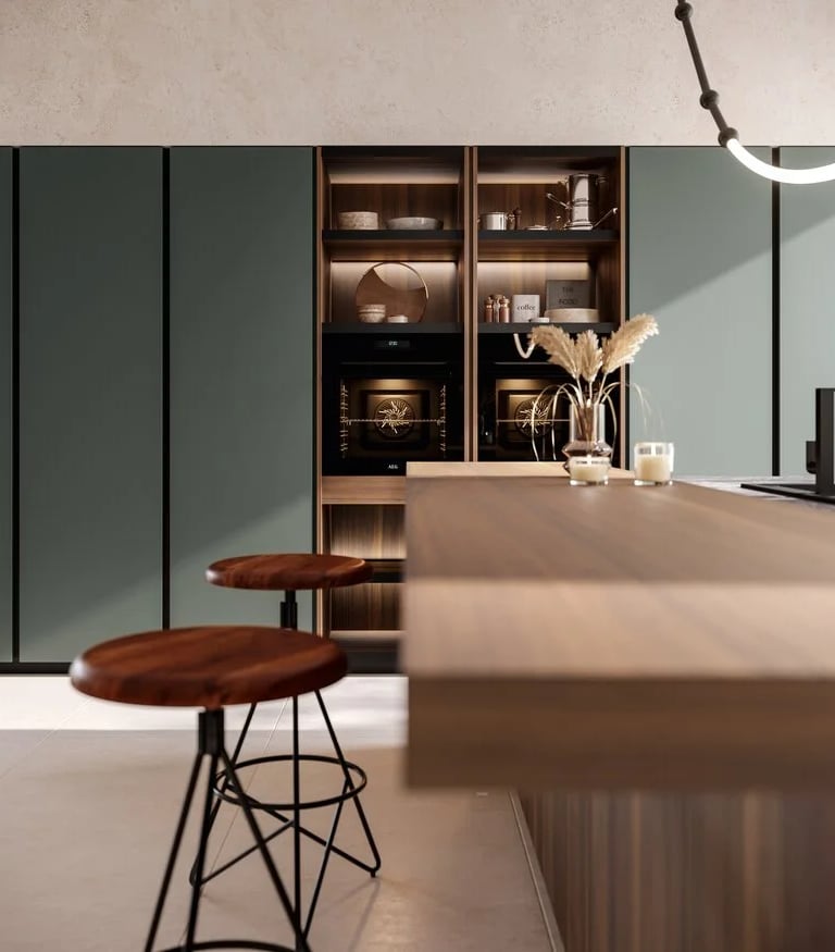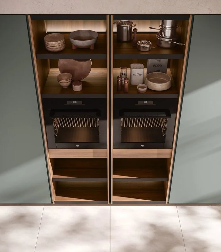 Les colonnes sont en Laminato PET Verde Polvere opaco, et les niches ouvertes Waind sont en Bilaminato Legno Noce Cordesco.